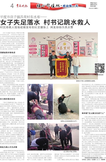 4月7日清晨7时左右,平度市店子镇昌里村东水库,一中年妇女不慎失足落水,昌里村党委书记祝秀山接到村民求救电话后,立即赶到事发现场,毫不犹豫地跳入刺骨的河水中,将落水者救出。“祝书记,好样的!”得知情况的村民们纷纷在村工作群里为祝秀山点赞。有村民将祝秀山救人现场的视频发布在社交媒体上,迅速引发了广泛关注。网友纷纷留言,为祝秀山跳河救人的英勇行为点赞。