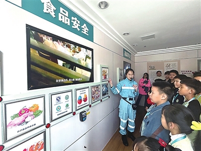 在食品安全学习室,当讲解员拿起几包各式各样的“五毛钱辣条”时,小记者们眼睛突然亮起来,并私底下开始议论纷纷。“同学们,你们吃过这样的辣条吗?从几岁就开始吃了?”面对讲解员的提问,小记者纷纷举起手:“我以前吃过,不过我妈妈说这是垃圾食品,就不让我吃了。”“我第一次吃的时候,觉得味道特别香,能让人上瘾。”“我一次都没有吃过,因为我爸爸说吃辣条就长不高了。”……“同学们,像辣条和街边小吃,平时要少吃或者不吃,因为里面有太多的添加剂,科学研究表明,添加剂摄入量过多对人体危害很大。除此之外,我们还要认识四个食品安全标识,分别是质量安全标识、无公害农产品标识、绿色食品标识、有机食品标识,这可以让你们更好辨别出真正的安全食品。”讲解员指着墙上的食品安全标识,小记者们则用心默默记下。