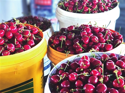 进入5月,青岛市场便能见到大棚种植的大樱桃。袁铭告诉记者,这两年青岛本地的大棚樱桃数量越来越多,从4月中下旬逐渐进入市场,现在每天交易量能达一千多吨,多数运往胶东半岛其他地方,露天大樱桃大量上市则要到5月下旬。