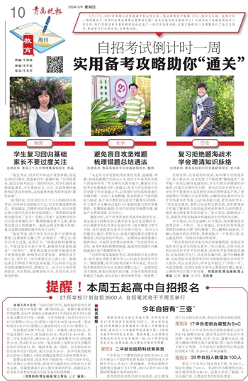 本报5月8日讯 “全民自招”时代,越来越多的考生将自主招生视为中考前“搏一搏”的好机会。根据市教育局发布的政策,2024年局属公办普通高中(不含综合高中)自主招生笔试继续实行统一命题。今年自招网上报名时间为5月10日(星期五)至11日(星期六)每天8:00至22:00;统一笔试时间为5月17日(星期五),面试时间为5月19日(星期日)。