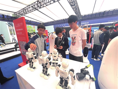 具备人脸识别、屏幕及动作互动、身份证识别等技术功能的智能服务机器人、能够避障并实现实时图像监测的智慧巡逻机器人、会下五子棋的机器人、能抓西瓜的3D视觉机器人……“AI赋能”主题区集中展示、体验岛城职业学校开发和应用的各类机器人,充满科技感的场景让学生们看得津津有味,犹如在逛科技馆。 观海新闻/青岛晚报/掌上青岛 记者 董真