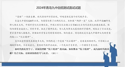 “学校面试内容侧重于人文底蕴、责任担当、实践创新等核心素养,考查学生的语言表达、逻辑思维、批判思维、信息处理和创新等能力。”青岛六十八中政治教师孙娜告诉记者,自招面试会结合学校举办的实践活动或者学校理念进行综合考查,与教学理念相符合,重视培养学生的各方面素质,提升学科核心素养。