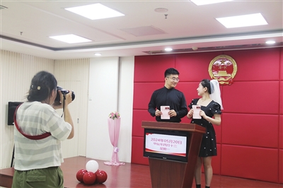 经过材料审查、婚姻情况询问等一系列严谨的流程后,“红本本”便新鲜出炉。新人们走出登记窗口,映入眼帘的是一系列充满甜蜜元素的打卡点。中式喜字背景墙、爱情时光印记、加大版结婚证和誓言卡等,这些精心设计的场景为新人们提供了一个绝佳的拍照背景。