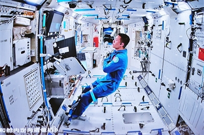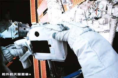 5月28日在北京航天飞行控制中心拍摄的神舟十八号航天员李广苏在空间站组合体舱外作业的画面(上图)。