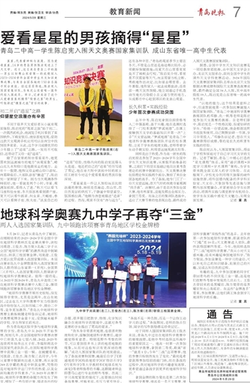 ~~~两人入选国家集训队 九中领跑该项赛事青岛地区学校金牌榜