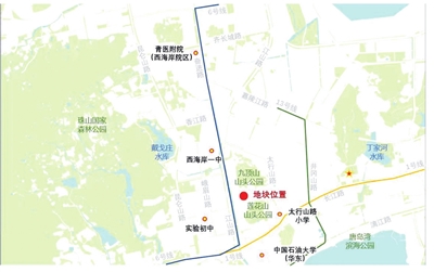 该地块临近江山路、长江路、漓江路、嘉陵江路、太行山路等主次干道,路网交织,1号线、6号线和13号线3条地铁线路交汇,距离地铁6号线的九顶山站1000米,且多条公交线交汇,交通便利。地块北侧为九顶山山头公园,南侧为莲花山山头公园,临近唐岛湾滨海公园,景观优美,景色宜人。邻近中国石油大学(华东)、西海岸新区实验初中、太行山路小学、长江路商圈、香江路商圈、三甲医院——青岛大学附属医院(西海岸院区)等公共服务设施,商业、教育、医疗等配套完善,是青岛西海岸新区不可多得的黄金地段。