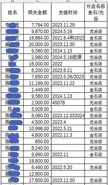 乐芙瑜伽馆有光谷店和金石店两个门店,宣女士向记者出示了两个门店会员自发登记的维权信息,375名会员尚有326万元课时费还未消费,其中今年5月份充值金额约23万元。消费者最近一次充值的日期则是6月17日。