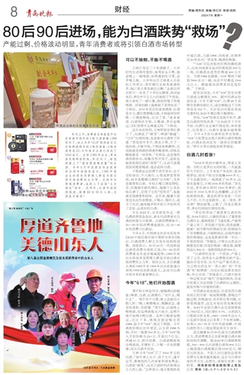 而且随着80后90后成为白酒消费主力,其消费观念正在影响着白酒市场的结构化调整。据2023年白酒销售数据,300—800元次高端白酒和800元以上超高端白酒规模达到3343亿元,增长比较突出。年轻人对白酒的品质和品牌文化要求越来越高,这正与白酒市场的多元化、品质化、高端化发展一脉相承。观海新闻/青岛晚报/掌上青岛 记者 雷林 (注:文中人名皆为化名)