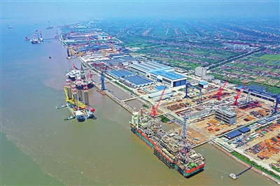 7月11日傍晚,坐落于崇启大桥北桥头堡、距上海仅60公里的启东海工船舶工业园里亮起点点灯光。夜幕下,一台台钢铁焊接的“巨无霸”耸立在水面上。园区某船厂的船坞内,一座已具雏形的巨大海上钻井平台正在加紧建造。