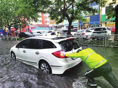 在城阳区,城阳交警在维护道路交通秩序的同时,多次助车辆脱困。河套中队在巡逻至安和路高速路口桥下时发现,因暴雨导致排水困难,多辆车熄火,民警、辅警和车主合力将车辆从水中推出;棘洪滩中队在锦宏东路双元路路口巡逻时,发现两辆轿车在路面无法启动,民警将两辆车上人员紧急疏散到安全地带。