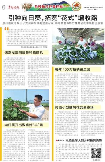 作为一名退役军人,王子龙为国防事业贡献了8年的青春,如今在乡村振兴的浪潮中找到了新的“战场”。2021年,王子龙敏锐地捕捉到了向日葵鲜切花种植商机,并带领当地村民一起投身这一产业,每亩地的纯利润在一万元以上,种植面积稳定在1000亩左右。眼下,每年约400万株向日葵通过线上线下销往全国各地,为他带来了丰厚回报的同时,也为村民们打开了致富的大门。