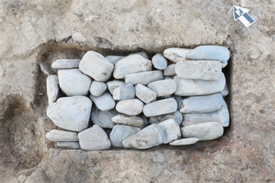 三星堆遗址发掘区出土的石斧坑第一层(2023年3月13日摄)。