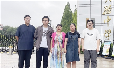 四名学子与班主任张芮合影。(左一王登辉,左二刘浩宇,右二夏聆溪,右一张一鸣)