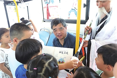 本报7月28日讯 不久前,公交李沧公司推出408“快乐巴”线路,将全线7部公交车装扮成了以国产动画片为主题的“童年时光”车厢,其中一部主题为《神笔马良》。28日,《神笔马良》作者后代来到青岛,带领数十位学子和经典“相约”车厢,开启一段暑期研学之旅。