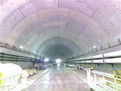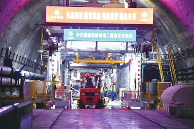 正在施工的胶州湾第二海底隧道是世界上建设规模最大、长度最长的海底公路隧道。8月6日,记者来到胶州湾二隧施工现场,从地面向下走过一段七层楼高的梯笼,到达盾构施工现场,并进入盾构机“腹中”。经过近七个月的“挖呀挖”,胶州湾二隧主线北线隧道已经完成了576米的盾构掘进,盾构机“深蓝号”正以每天8米左右的速度向前掘进。