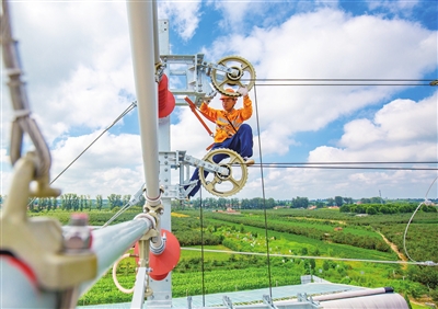 在距离地面约7米处,高川头顶烈日,腰间绑着安全带,右手握着扳手,左手抓住上方的棘轮,一脚蹬在接触网支柱上,一脚踩着补偿绳。对于检修调整棘轮补偿装置这类户外作业,他早已驾轻就熟。