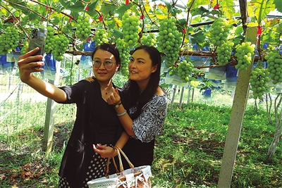 本报8月28日讯 8月28日,游客李菲和亲友来到即墨区蓝村街道一家葡萄合作社的果园采摘品尝葡萄。“还是本地种的葡萄,新鲜、好吃。”李菲一边吃,一边赞叹不已。