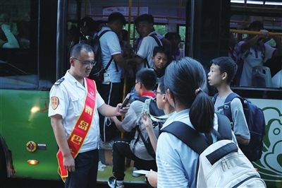 开学第二天,在家人和分公司的支持下,放学时臧忠锴便走进了玉兰花园公交站,开启了自己的志愿服务路。也是从那一天起,原本每天固定上早班,有充足时间接孩子放学的他,却总是顾不上接。“孩子很支持我,说我有爱心,是他的榜样。”谈及孩子,臧忠锴满脸幸福。每次开展志愿服务时,臧忠锴在公交站不停地奔波,协助当班驾驶员使用手持POS机在车外给学生打卡;及时疏导周围车辆,确保道路畅通;引导学生有序上车,避免公交车滞留站内。每次,只有等学校关了门,公交站没有学生等车,他才会安心回家。转眼间,两年时间过去了。玉兰花园公交站,臧忠锴已经驻守了300多个小时。“每次志愿服务的时候,在外面站一个小时左右,春秋还好,就是夏天和冬天有点难熬。”臧忠锴说道。