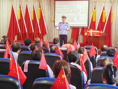 9月3日上午,城阳区山角社区居民委员会的会议室内,50多名居民正在聆听交警孔凡立带来的交通安全课。