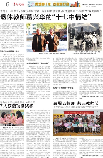 1958年,葛兴华大学毕业后被分配至平度一中,成为一名深受学生喜爱的物理老师,一干就是30年。1988年,他接到青岛十七中伸出的“橄榄枝”,重返母校执教。“再次回到十七中,校园有了很大的变化,硬件设施更好了,熟悉的老师绝大多数也已退休,只剩何士森和赵志贤两位曾经教过我的老师,但老师、学生昂扬向上的精神面貌没有变,还是有一种久别重逢的亲切感。”葛兴华感慨地说道。
