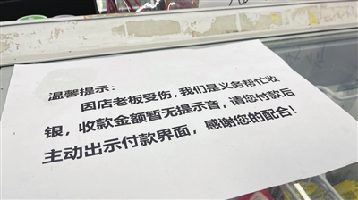10月26日下午5时,记者来到崂山区株洲路依山伴城锦城小区的小超市和菜鸟驿站,发现忙着收款的是两个十来岁的学生,他们耐心地用计算器核算找零,而在整理货架的是两位四五十岁的女士,尽管动作不够熟练,但依然耐心地与前来取快递的业主们交流。记者注意到收款台旁的冰柜玻璃上贴着一张纸,上面写着:“因店老板受伤,我们是义务帮忙收银,收款金额暂无提示音,请您付款后主动出示付款界面,感谢您的配合。”