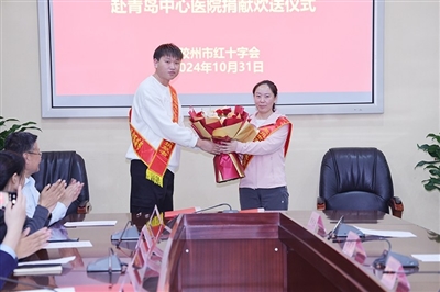本报11月1日讯 10月31日,胶州市红十字会在行政东楼为同济大学附属东方医院胶州医院急诊科护士田婷举行欢送仪式。作为一名造血干细胞捐献者,田婷将赴青岛市中心医院进行造血干细胞采集。田婷是青岛市第210例、胶州市第14例造血干细胞捐献者。