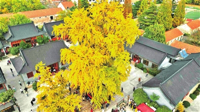 近日,坐落于青岛市城阳区、拥有近1600年历史的法海寺内,两棵古银杏树迎来一年中最美的时刻,吸引了众多市民前来打卡。千年银杏树已经金黄满身、秋韵十足。
