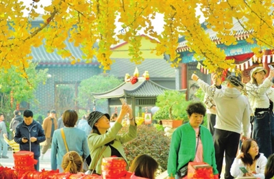 记者发现,来此拍照打卡的游客络绎不绝,甚至有旅行团乘坐大巴车专程来观赏。在银杏树下,有不少拍照留念的姑娘,着一身汉服,侧身抬头仰望,让那高耸的银杏叶成为背景。随着相机快门的咔嚓一声,一张唯美至极的照片便定格了这金色的瞬间。