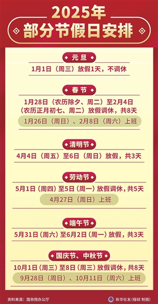 新华社北京11月12日电 国务院总理李强日前签署国务院令,公布《国务院关于修改〈全国年节及纪念日放假办法〉的决定》(以下简称《决定》),自2025年1月1日起施行。《决定》共2条,主要规定了以下内容。