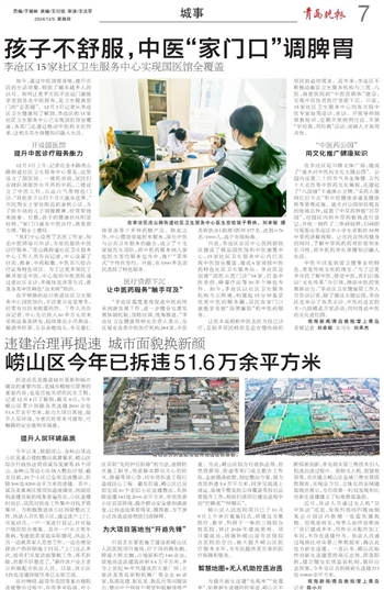 在对绅园、温哥华花园等重点楼院违建整治过程中,在雨季来临前,对小区采取“先防护后拆除”的方法,前移防水施工顺序,兜底解决群众关心的防水、渗漏等烦心事,切实将拆违工程打造成民心工程。截至目前,崂山区已全部完成10个老旧小区违建整治,共拆除违建143处2000余平方米,有效改善小区宜居环境,提升群众安全感和满意度,让拆违成果看得见、摸得着,为下步小区改造进场彻底扫清障碍。