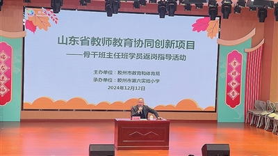 本报12月12日讯 为了打造一支综合素质高、工作能力强的新时代骨干班主任队伍,提升教师队伍建设水平,12月12日—13日,由胶州市教体局主办,浙江大学选派指导专家对山东省教师教育协同创新项目——骨干班主任班学员进行返岗指导并进行专题培训,12日首场活动在胶州市第六实验小学举办,杭州市富阳区大源中学德育副校长、高级教师夏立明校长为骨干班主任班学员带来了一场教育界的头脑风暴。