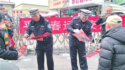本报1月26日讯 26日,农历腊月廿七,迎来春节前最后一个李村大集。当天上午,李村大集周边道路人流车流密集,青岛李沧交警安排警力疏导交通,向赶集市民赠送福字,宣传道路交通安全知识。