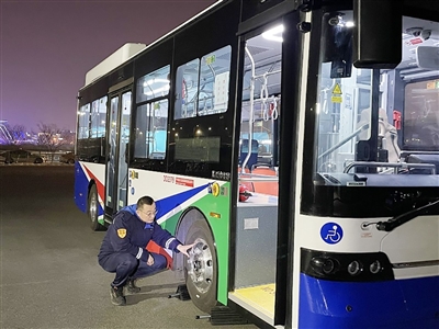 十分钟后,休息调整完毕,倪师傅走进场站里进行班前准备。记者看到,对于此次班前准备,倪师傅早有计划,他从车厢外检查到车厢内,轮胎、车载灭火器、车内座椅等,每一项检查都有条不紊。检查无误后,倪师傅拿起抹布,开始擦拭方向盘和车内扶手。“新年新气象,希望在迎接乘客时,我脸上的笑容是温暖的,车厢环境是整洁舒适的。”倪师傅笑着说道。23时18分,倪师傅将抹布收好,下车取出掩木,驾车往始发站赶去。