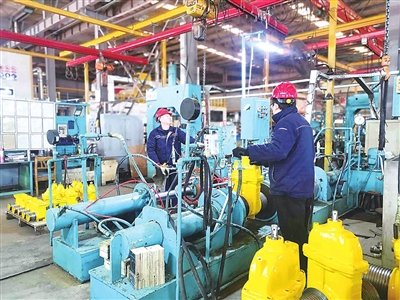 在青岛伟隆阀门股份有限公司生产厂房内,工人们在各自工作岗位上忙碌着,装配车间里,一个个阀门被整齐有序地摆放,刚刚打包完成的木箱高高叠放在一起。