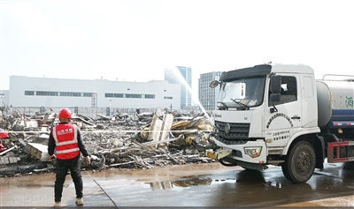 在拆除施工现场,执法人员与施工方沟通着拆除计划、施工进度和需要注意的问题:“进入春季,大风天气较多,施工过程中一定要注意做好喷淋防尘措施。还要注意施工时间,上午十一点半后,下午一点之前这段时间不要施工,以免影响周边办公单位人员休息……”