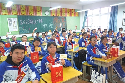送“开学礼包”、课桌上插着气球、走过“梦想之门”……各班“开学第一课”上,班主任精心设计了迎新仪式。“平时你们总是说我画饼,这次老师春节去云南旅游,给你们带的礼物是鲜花饼,祝愿大家新学期一路繁花似锦。”初二19班班主任刘淑娜为每名学生准备了“开学礼包”,里面是鲜花饼和两张心愿卡,同学们在卡片上写下自己和“学习搭子”的小目标,明晰新学期的努力方向。