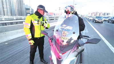 当天下午5时40分许,跨海大桥高架路东向西、靠近黑龙江路匝道路段,通行的车辆越来越多。“停车!”执勤民警马邵腾拦下一名骑摩托车的小伙,检查小伙的驾驶证和车辆行驶证后,马邵腾告知对方,跨海大桥高架路等属于摩托车禁行路段。“在每个匝道入口,都有摩托车禁行的标志,你下次一定要注意!”马邵腾对小伙依规作出处罚,随后要求他从就近匝道驶出高架路。