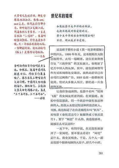 《弹幕书》的排版,在正文之外留有空白,这些空白不仅有“时光点评团”的点评,还可以让读者用笔在上面写写画画。“弹幕是网络时代人们的表达习惯,这似乎也是一种不错的‘交互’。”薛易说,《弹幕书》可以让“交互”一直持续下去。