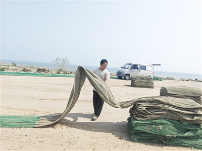 4月30日下午2时,在南姜码头南侧空地上,一位渔民正在缝补渔网。她告诉记者:“渔船出海打鱼,划破渔网是常有的事。今年春季收成不错,牙片鱼大丰收。就要封海了,今天晚上要再出海捕捞一次,少下一次网,早点返程。”附近还有几位渔民正在将晒好的渔网折叠捆好,装入面包车。
