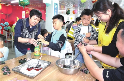 活动将包粽子这一传统习俗转化为亲子协作的趣味竞赛,翠绿粽叶与晶莹糯米在家庭团队的巧手中化为形态各异的粽子,既有棱角分明的“标准款”,也有形状各异的“创意款”。妙趣横生的互动形式打破了传统技艺的传承壁垒,孩子们踮脚模仿折叶、填米的动作,在弥足珍贵的团圆时刻,完成从生疏到熟练的蜕变,使端午文化不只是书本上的文字,而是具象化为指尖的温度。手工龙舟制作环节,忙碌在工地上的产业工人化身“造船师”,帮助孩子拼装可漂浮的龙舟模型,在亲子协作中,孩子们深入理解龙舟文化中“同舟共济”的精神内核。值得关注的是,六一节和端午节的巧遇,让抽象的文化符号转化为可触摸、可感知的实物。活动结束后,每组家庭获赠五色绳,既是对劳动成果的肯定,也延续了端午祈福的传统习俗。