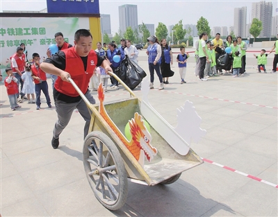 工地上助力工人搬运货物的“小推车”成为趣味运动会“渡江大作战”环节的主角,每一组小朋友将气球放到小推车上,爸爸妈妈化身“大力水手”,护送气球宝宝安全渡江。趣味运动会不仅锻炼了身体,也增强了产业工人子女对父母工作的理解,既拉近了亲子距离,又在欢声笑语中展示产业工人匠心建造、协同作战的“拼搏精神”。