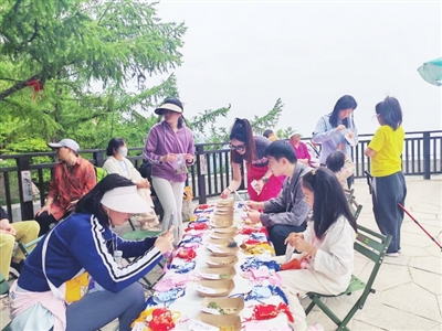 在巨峰游览区索道上站观景平台,景区设置了国潮体验区,投壶、香囊DIY制作、幸运转盘等项目吸引游客驻足参与。每一项体验完成,游客都能从工作人员手中收获一份别致的纪念品——承载心愿的祈福牌、印刻崂山美景的明信片,或蕴含驱邪避疫之意的艾草香囊。