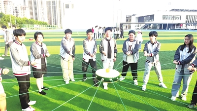 随后,“后背寄语”环节温馨开启。高三学子们在彼此后背写下真挚的祝福与鼓励。一时间,操场里满是欢声笑语,“加油,你是最棒的”“高考必胜,顶峰相见”“稳住心态,超常发挥”……一句句暖心话语、一个个充满力量的符号,不仅体现了同学们之间的深厚情谊,更承载着大家对彼此的美好期许。在这一过程中,同学们感受到伙伴的支持,脸上绽放出灿烂笑容。拉鼓击球活动将现场气氛推向高潮。每个班级分成若干小组,小组成员共同拉住绑在鼓四周的绳索,将鼓面向上托起,一个小球放置在鼓面上。大家需通过默契配合,控制鼓的平衡与力度,让小球在鼓面上连续跳动。活动现场加油声、呐喊声此起彼伏。起初,同学们不太适应,小球频频掉落,但大家毫不气馁,不断调整策略。随着练习深入,各小组渐入佳境,小球在鼓面上欢快跳跃,跳动次数不断增加。同学们在活动中尽情释放压力,体会到团队协作的乐趣,收获了满满的成就感,现场洋溢着青春的活力与激情。