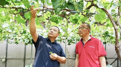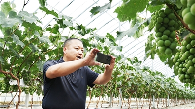 “着色期最佳温度28℃,夜温不低于13℃,昼夜温差不少于12℃。如果当晚温度过低就得下午3点闭棚保温,这样培育的葡萄里外全色能卖个好价……”近日,在青岛莱西市沽河街道办事处吕家庄村的一处葡萄大棚里,贾延樽一边为葡萄分叉,一边通过手机“一起葡萄”微信号,向在线的果农讲解葡萄着色期的管理。在田间开直播这样的场景对他来说是家常便饭。“沿着‘云’端学技术,跟着老贾创增收”,已然成为全国多地葡萄种植户的“口头禅”。