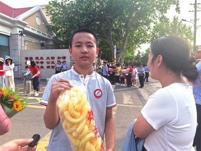 在青岛三中考点外,家长们准备的各式花束让“迎考”现场变成美丽的海洋。人群中,12岁男孩张桠硕捧着的“花”与众不同,他和爸爸妈妈一起来迎接结束高考的哥哥,准备的礼物是一大包爆米花。“我们一家人原来准备买鲜花,但看到爆米花之后就改了主意,爆米花的寓意好,感觉送这个也很有意思。”孩子妈妈告诉记者,两个儿子年龄相差6岁,从小感情就特别好,弟弟一直把哥哥视作偶像。“爆米花也是‘花’,还是哥哥喜欢的零食。”张桠硕说,哥哥高三学习很辛苦,希望高考结束后哥哥能好好休息,同时拿到满意的成绩,考上心仪的大学。