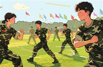 大院的大操场是夏天固定的放映场。以放映机为界,前面是家属区,后面是师部直属连队的观影区。尤其是家属区,孩子们早早就占满了长凳短凳、高凳矮凳,有的还搬来几块砖头石块占位,还有的干脆用粉笔在地上画个大圆圈“圈地”,有时难免发生口角。连队的观影区则井然有序,战士们拿着马扎,喊着口号,或一路高歌,有序入场,一排排坐得横平竖直,方方正正。尤其是连队间的拉歌,激扬高亢,此起彼伏,成了放映前一道亮丽的风景。《打靶归来》《黄河大合唱》《我是一个兵》等脍炙人口的歌曲响彻黄昏的天空。这些经典老歌我至今都会哼唱,现在还时常伴随着我的晨跑,那铿锵的旋律给予我力与美。