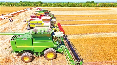 本报6月13日讯 12日上午,位于西海岸新区大场镇的市级绿色增粮先行区种植基地,集中连片的麦田金浪翻滚,麦穗颗粒饱满,5台小麦联合收割机正开足马力,在麦田中忙碌穿梭,一垄垄成熟的小麦被卷进机器,小麦收割、麦穗脱粒、秸秆还田、机收减损等作业环节一气呵成。今年,全市夏粮面积、单产、总产有望实现“三增”。另据农情调度,截至6月12日17时,全市已收小麦92万亩,进程过两成,预计6月22日左右完成收获。