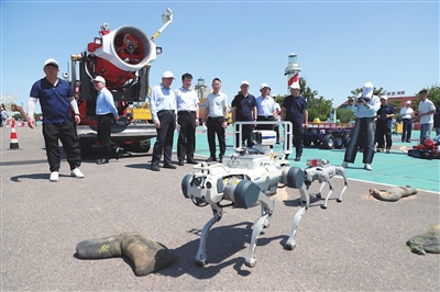 应急救援机器狗第一时间进入事故现场内部,通过气体检测仪,实时探测灾害现场是否存在气体泄漏,确认现场救援环境安全性,明确消防救援人员应携带的救援装备。移车灭火机器人将阻隔道路的车辆移开,打通救援通道,并对“着火”的车辆进行灭火。耐高温灭火机器人进入起火区域开展灭火,主动灭火机器人有效识别100米内火源,并自动调整车身及水炮角度灭火;地震搜救机器狗进入现场进行生命体征探测,并携带救援工具跟随消防救援人员施救。
