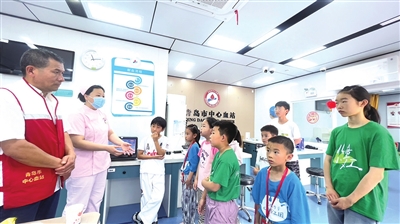 6月15日上午,在血站工作人员的带领下,小记者们首先参观了献血屋的各个功能区,从登记区、体检区到采血区,详细了解献血的完整流程。“从登记、填写健康问卷,到初步体检、血液快速检测,献血前需确保献血人身体健康才能采血。”胶州市红十字会志愿者薛鹏秋为小记者讲解献血的基本知识。“原来献血前要先测血红蛋白,还要检查血压。”小记者马畅鸿感叹。血站工作人员解释:“献血要经过严格的健康筛查,确保献血者和用血者的安全。”