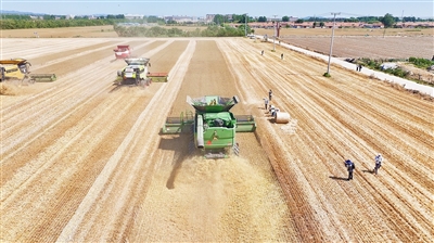 6月12日上午,全市“三夏”生产推进会在西海岸新区大场镇市级绿色增粮先行区举行,集中连片的麦田金浪翻滚,5台小麦联合收割机正开足马力,在麦田中忙碌穿梭,小麦收割、麦穗脱粒、秸秆还田、机收减损等作业环节一气呵成。
